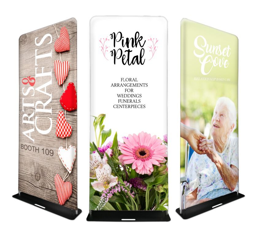 All of our trade show products are designed to fit in a typical trade show booth setup. Some of our background displays are 10 feet wide and are the perfect solution for these settings. Nonetheless, while planning your tradeshow booth remember that you do not want so many signs that there is no space to operate within your booth; nor do you want to block the entrance to a booth so that it is closed off to those walking the show. If you need help planning out your booth don’t hesitate to contact us!