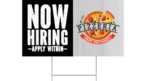 A now hiring sign is essentially any type of sign made from any type of material that is created for the purpose of attracting potential hiring candidates and new employees. These signs can have a standard design and message or can be personalized with the logo of your business and any custom message. Common messages used on now hiring signs include "now hiring," "help wanted," "now accepting applications," and "positions available." Placing a now hiring sign within or outside of your business or storefront is a great way to spread the word that you are in need of new employees. If done effectively, your help wanted sign could very well bring your business the perfect employees you have been searching for!