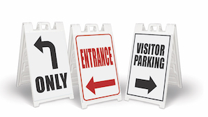 Know Your Directional Sing Needs - Use as few signs as possible that clearly point where people need to go. Decide whether your sign needs to be permanent or temporary. For example, directional signs within a building are frequently mounted permanently using standoffs, screws, or adhesive. You can also make good use of temporary directional signs by pointing guests to seating at a restaurant with a high quality A-Frame sign or showing customers where special sales are happening in your retail location. Standoffs, screws or adhesive work great to mount signs to walls. Yard signs and A-frame signs can be easily posted on the side of roads and sidewalks for temporary use.