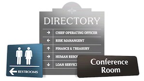 Wayfinding - Wayfinding signs are generally grouped together in a system of signs that direct people through a space. These signs include maps and directories, directional and arrow signs placed strategically throughout the area, and room identification signs or labels. We will discuss wayfinding sign systems in greater detail below.