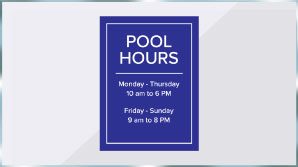 - Pool Hours - Keep swimmers out of your pool and let them know when to come back with pool hours signs. If you want to enforce your pool hours even further, consider adding a video surveillance sign as well. Besides posting the hours of operation, you can also include warning messages such as “No Swimming After Dark” or “Do Not Use Pool When Closed”. There are few regulations around the size and lettering height for these signs. We recommend making them a size that can be easily seen and read and placed at each entrance to your pool.