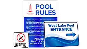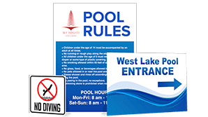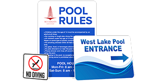 - Pool Rules - Pool rules are one of the most common signs used at pools. They allow you to post all of the rules required by you and your local government to ensure the safety of swimmers and the preservation of your pool. These signs are generally 18” x 24” and contain letters anywhere from ½” tall to 4” tall. Pool rules signs are commonly placed at each entrance to the pool as well as other various locations around the perimeter of the pool.